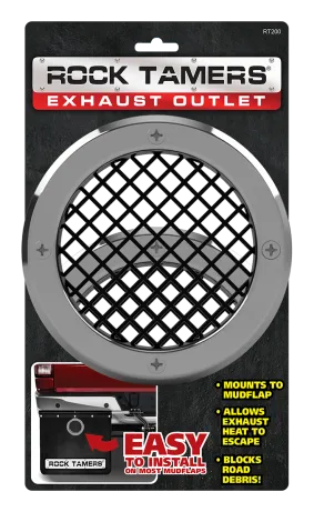 Rock Tamers RT200 Exhaust Outlet -- An add-on mudflap accessory item that allows hot exhaust gases to flow through the mudflap. Designed to keep rubber mudflaps from overheating when used on vehicles with rear facing exhaust systems (factory as well as aftermarket).