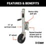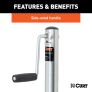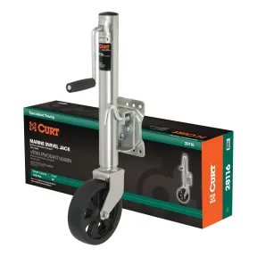 In our goal of being your best source for all things towing, the CURT line of trailer jacks is designed with care and manufactured with pride. CURT jacks are made with quality to promote the life and function of your trailer, and they come in several different styles to accommodate your needs, whether you are a frequenter of the boat landing, the campground, the racetrack or the field. Designed to withstand the wear and tear of frequent water exposure, CURT marine jacks are the jack of choice for the avid fisherman or boating enthusiast. Our marine jacks have a few features that make them a special addition to our trailer jack line. Unlike any of our other jacks, CURT marine trailer jacks are equipped with wheels, allowing for greater mobility and easier coupling of your trailer. Choose from models with one or two wheels. Marine jacks also have a heavy-duty pull-pin that allows them to pivot on their mounting bracket to be out of the way for travel. To protect them from corrosion and the damage of moisture, these jacks come with a zinc finish. This CURT marine jack features a weight capacity of 1,500 lbs., a travel of 10" and a wheel diameter of 8". It comes with a side-wind handle and all the necessary bolt-on hardware for a complete installation. It does not matter what kind of trailer you tow -- a boat trailer, utility trailer, livestock hauler or recreational vehicle trailer -- if you have a receiver-style trailer, you will want a jack that complements its function. For a trailer jack that will not steer you wrong, CURT has the answer.